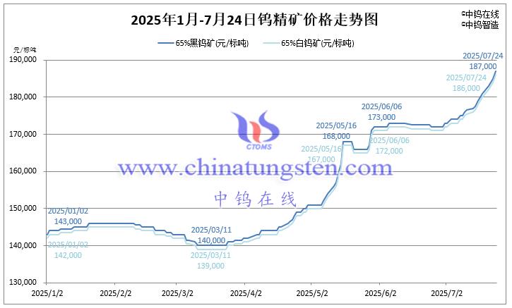2025年7月24日,65%黑钨精矿报价18.7万元/标吨,比年初涨了30.8%!65%白钨精矿18.6万元/标吨,涨了31%!