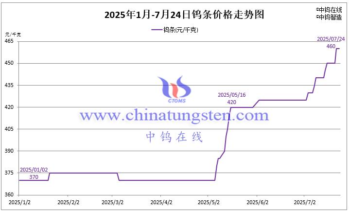 2025年7月24日,钨条价格报460元/公斤,比年初涨了24.3%!