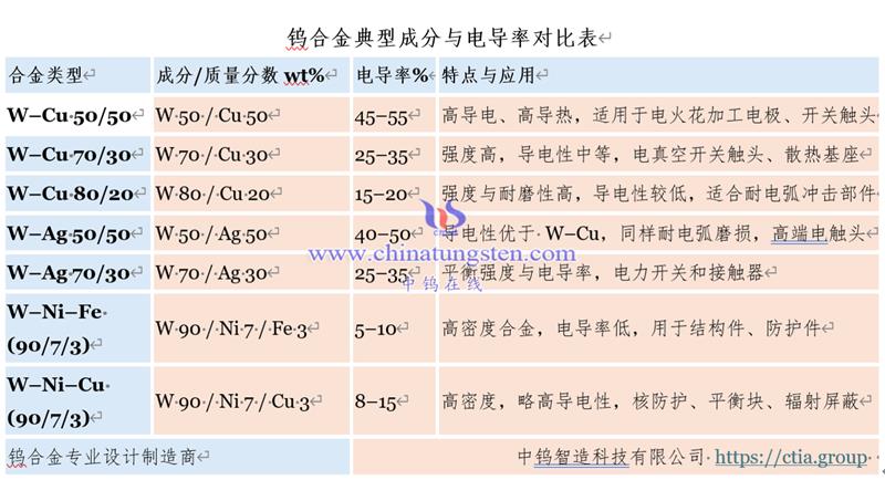 钨合金导电性远低于铜,但通过与高导电金属(铜、银)复合,可获得兼具高强度、高密度和中等导电性能的材料。特别是 钨铜合金(W–Cu),是电极和电触头的主力材料。