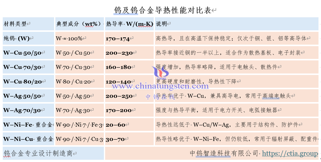 而 W–Ni–Fe 等重合金则以高密度和力学性能为主,导热性能较差。