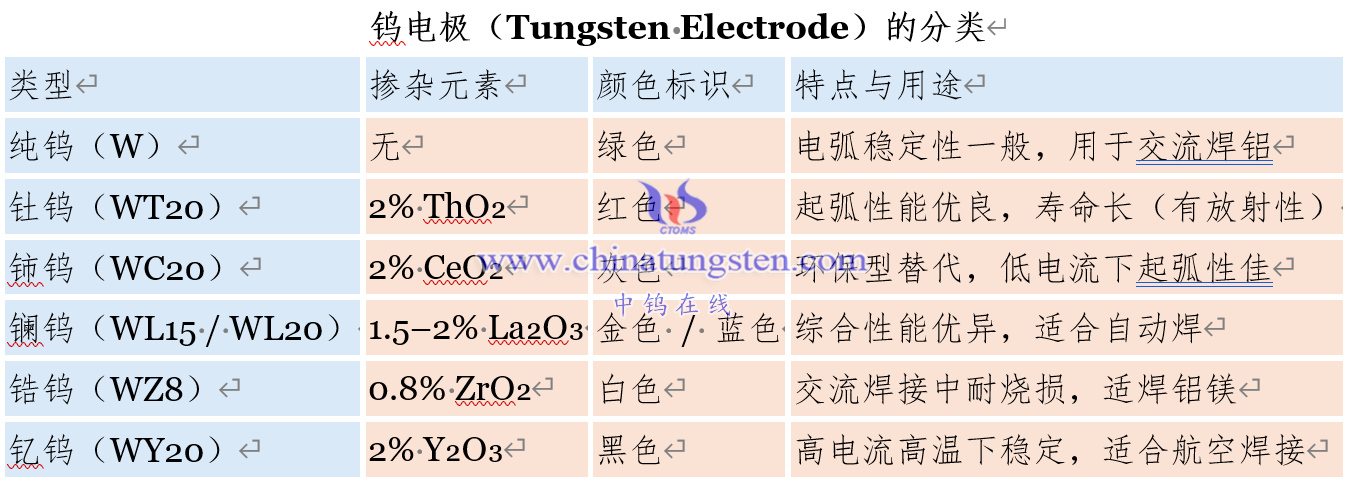三、钨电极(Tungsten Electrode)的分类(按掺杂元素)