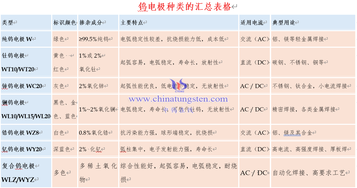 钨电极种类的汇总表格