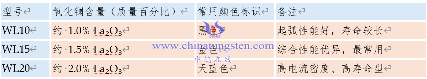 镧钨电极根据氧化镧含量不同,常见型号包括: