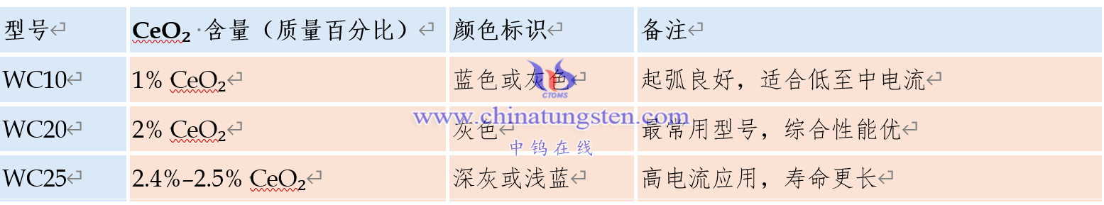 WC10 | 1% CeO₂ | 蓝色或灰色 | 起弧良好,适合低至中电流 |