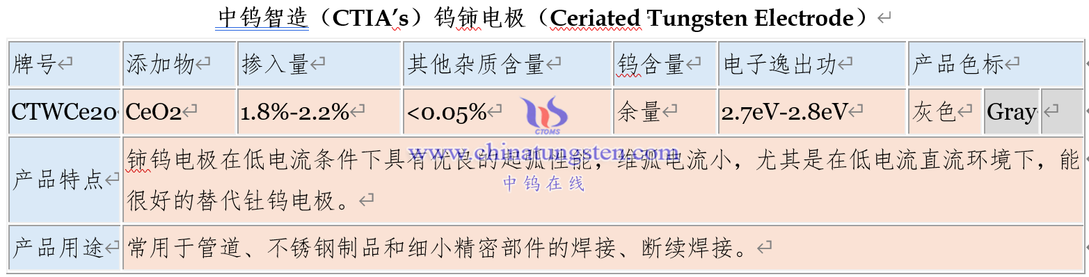 CTWCe20 | CeO2 | 1.8%-2.2% | <0.05% | 余量 | 2.7eV-2.8eV | 灰色 | Gray | |