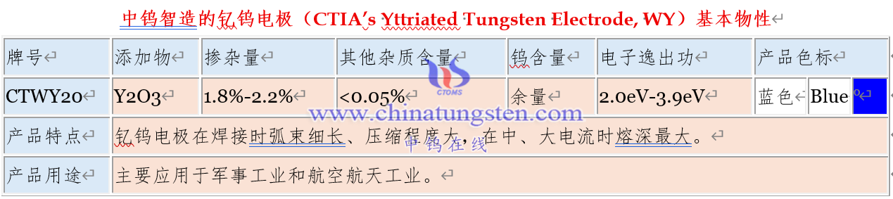 中钨智造的钇钨电极(CTIA’s Yttriated Tungsten Electrode, WY)基本物性