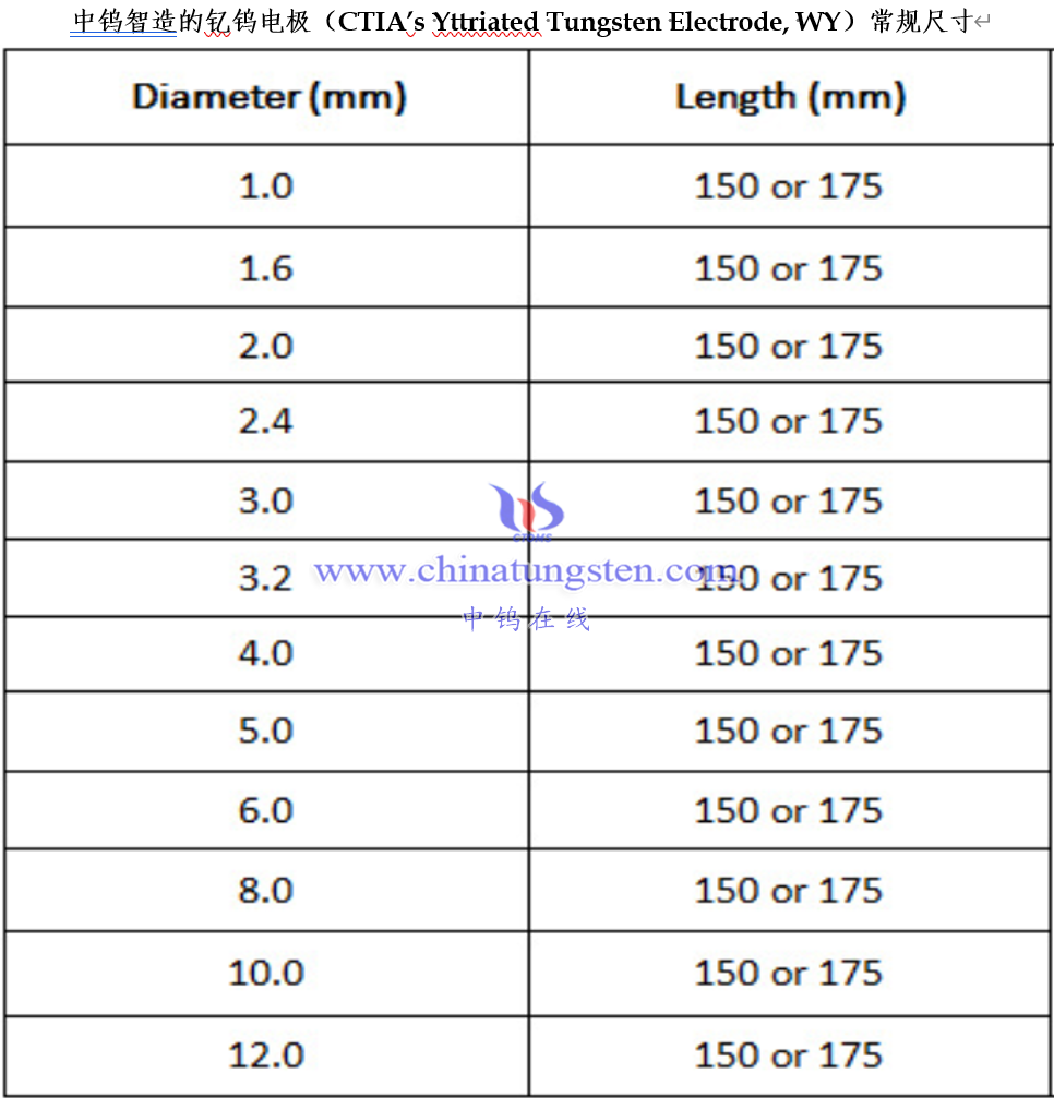 中钨智造的钇钨电极(CTIA’s Yttriated Tungsten Electrode, WY)常规尺寸
