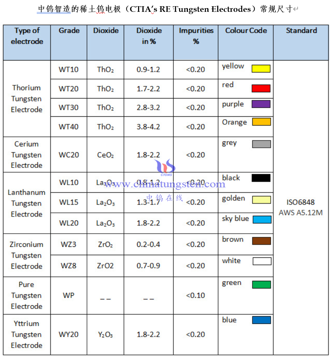 中钨智造的稀土钨电极(CTIA’s RE Tungsten Electrodes)常规尺寸