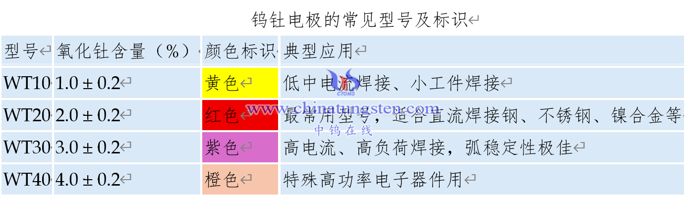 型号 | 氧化钍含量(%) | 颜色标识 | 典型应用 |