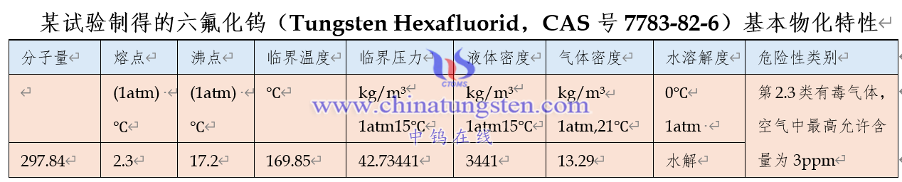 某试验制得的六氟化钨(Tungsten Hexafluorid,CAS号7783-82-6)基本物化特性