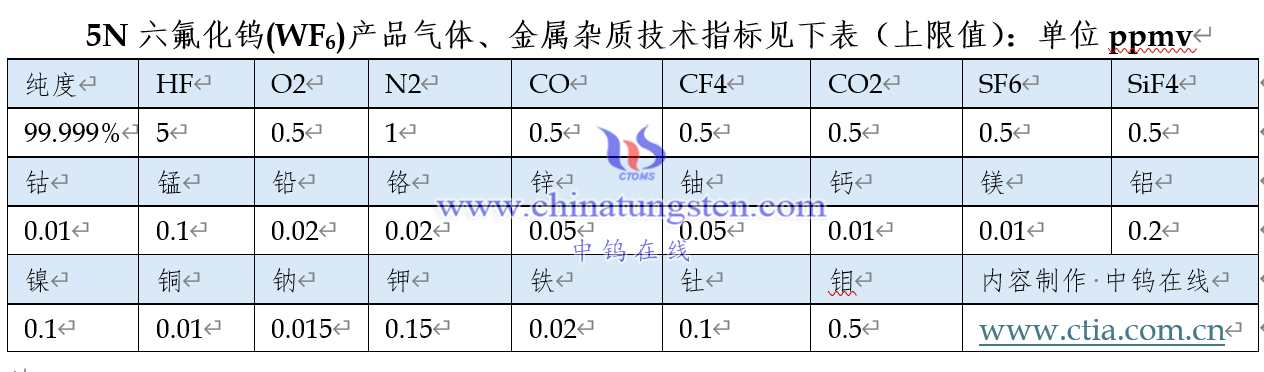 5N六氟化钨(WF6)产品气体、金属杂质技术指标见下表(上限值):单位ppmv