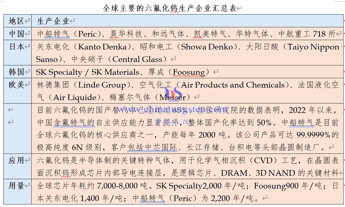 早在2010年前后,我国钨业界就进行了成功的实验,但并未投入工业化生产;目前我国除了中船特气、昊华科技等企业有六氟化钨生产技术,中船特气作为国内产能领先的厂商有年2000吨产能。