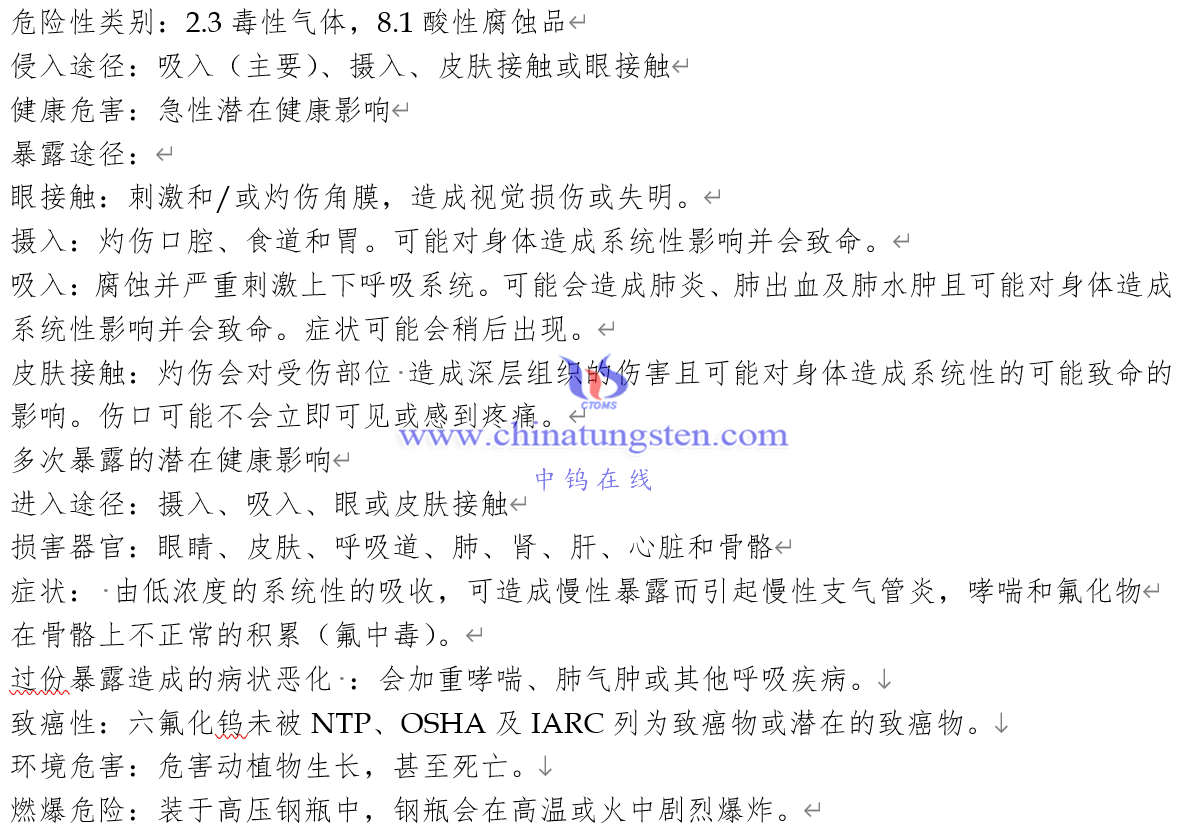 刺激性:六氟化钨会造成严重的灼伤。且灼伤可能不会立刻看到或感觉疼痛。