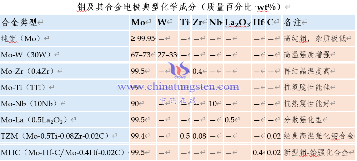钼及其合金电极典型化学成分(质量百分比 wt%)