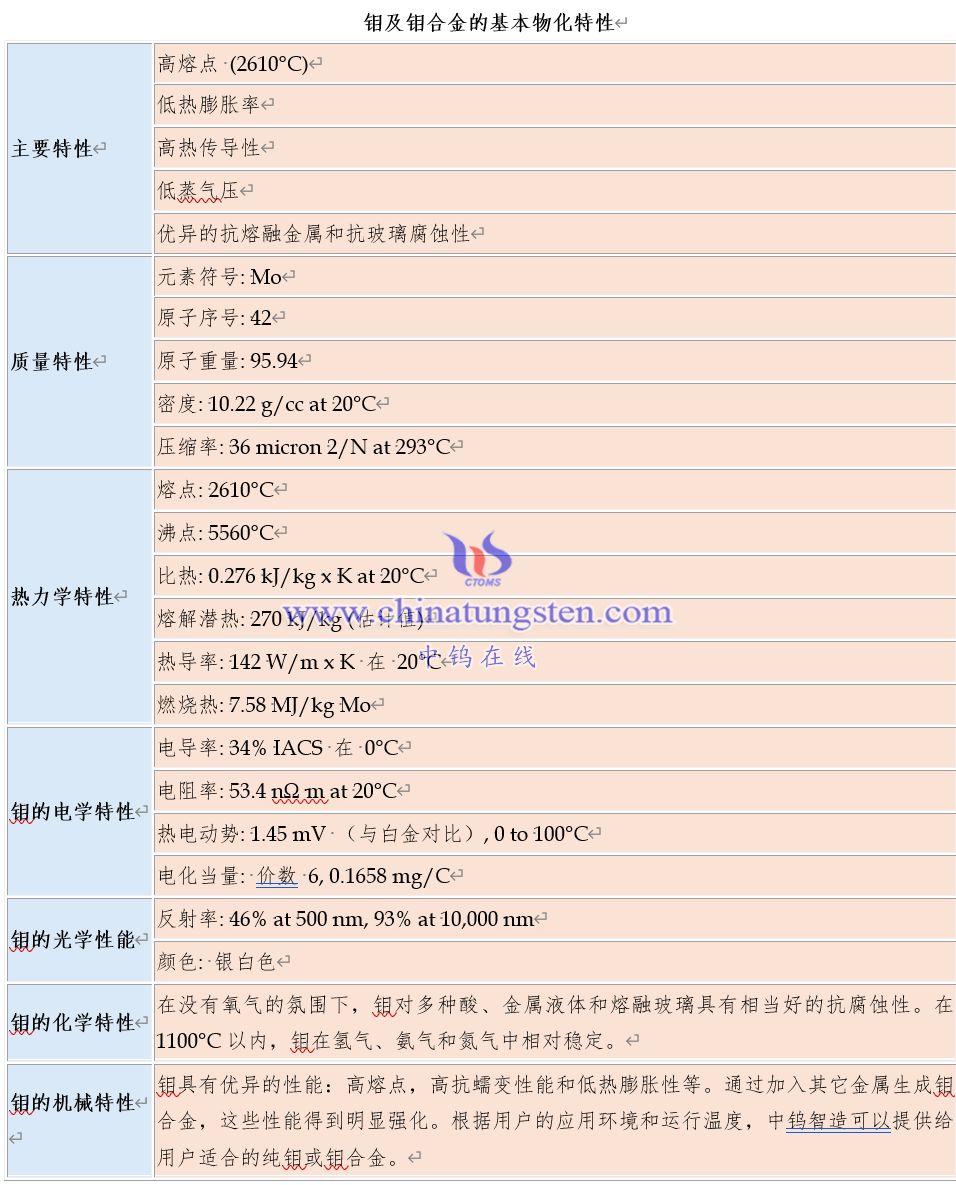 中钨智造钼及钼合金的基本物化特性