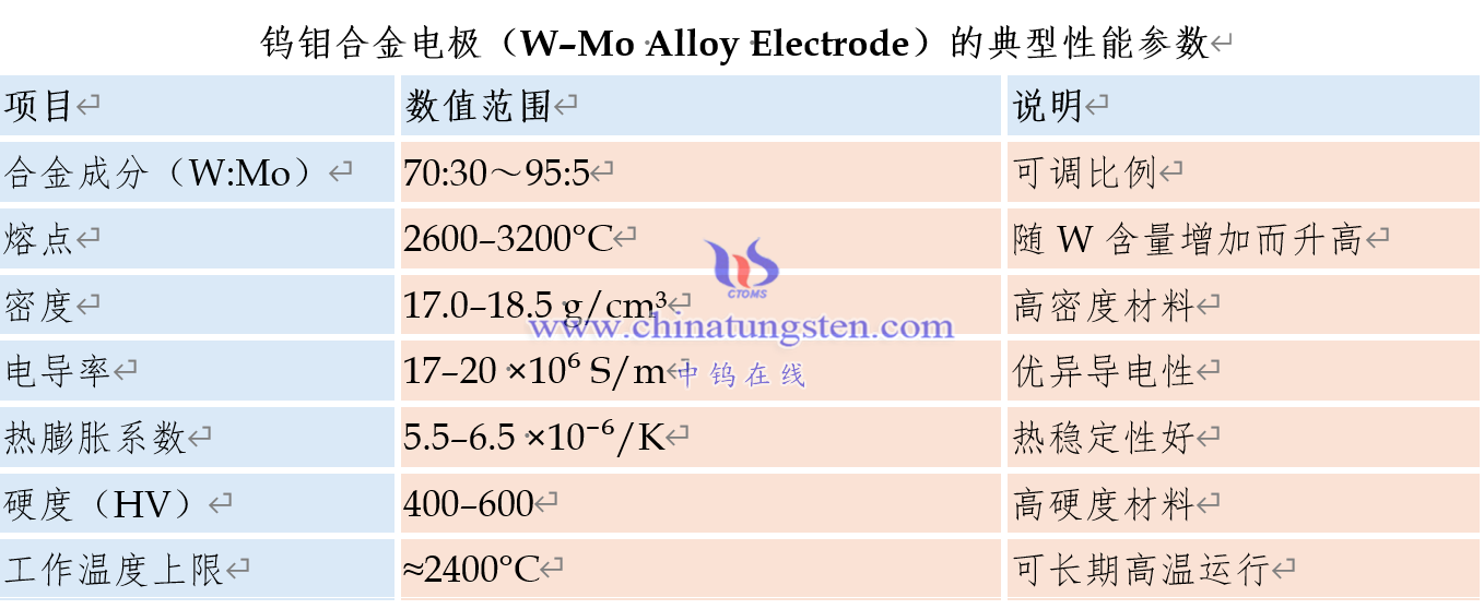 四、W–Mo合金电极典型性能参数(参考值)
