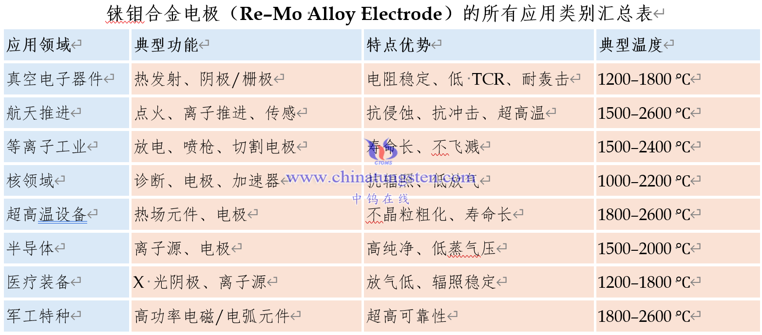 九、铼钼合金电极(Re–Mo Alloy Electrode)的所有应用类别总结(汇总表)