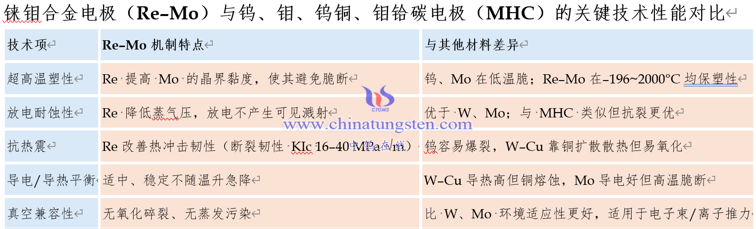 铼钼合金电极(Re–Mo)与钨、钼、钨铜、钼铪碳电极(MHC)的关键技术性能对比