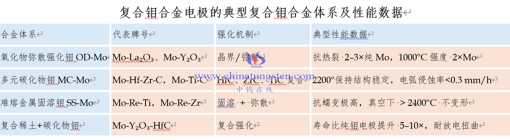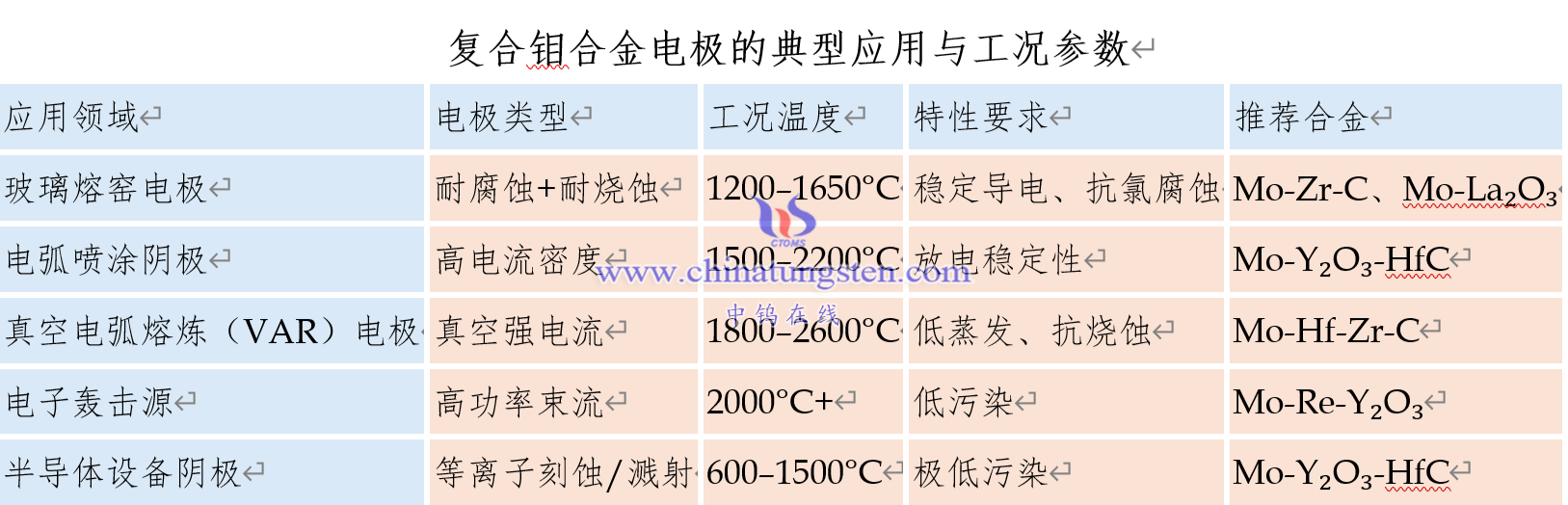 复合钼合金电极的典型复合钼合金体系及性能数据