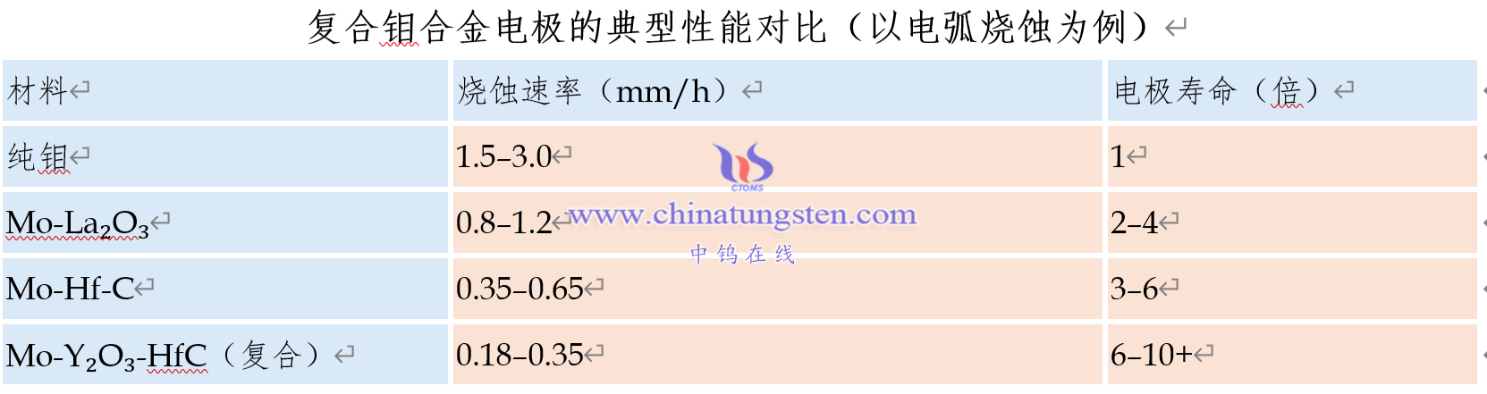 复合钼合金电极的典型性能对比(以电弧烧蚀为例)