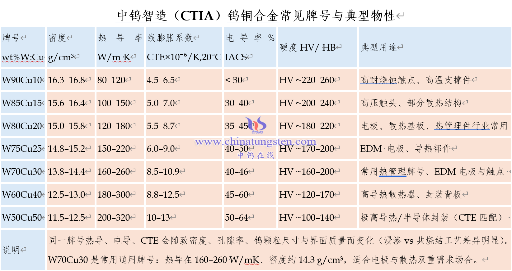 中钨智造(CTIA)钨铜合金常见牌号与典型物性