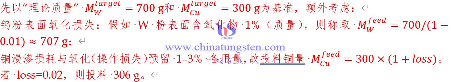 铜浸渗损耗与氧化(操作损失)预留 1–3% 备用量,故投料铜量 M_Cu^feed=300×(1+loss)。若 loss=0.02,则投料 306 g。