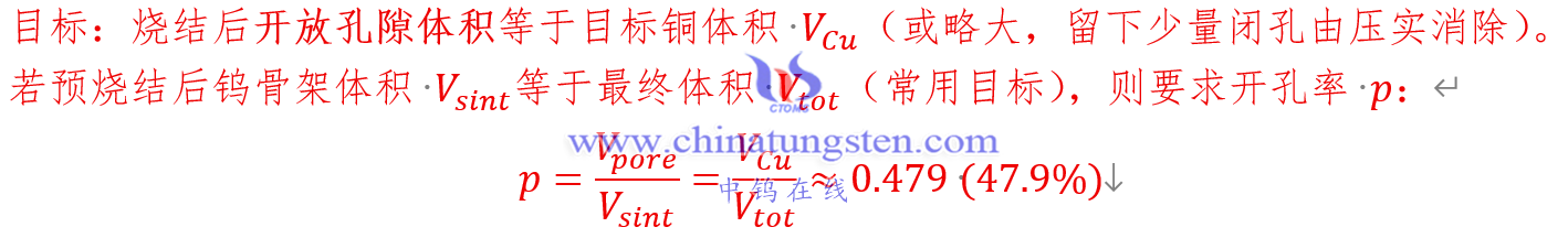 若预烧结后钨骨架体积 V_sint等于最终体积 V_tot(常用目标),则要求开孔率 p: