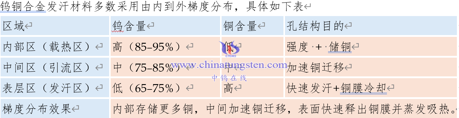 钨铜合金发汗材料多数采用由内到外梯度分布,具体如下表。