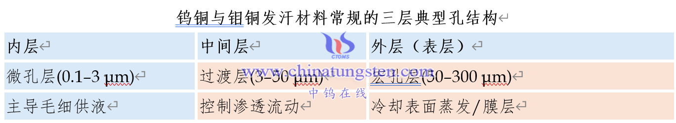 钨铜与钼铜发汗材料常规的三层典型孔结构