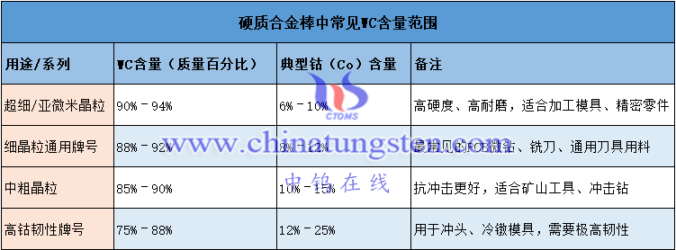 • 如果是高韧性或矿山用棒材,WC会降到80%–88%。