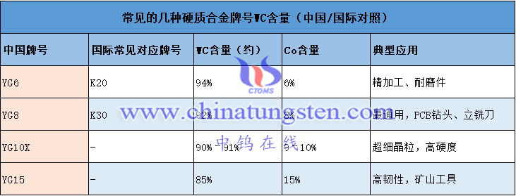常见的几种硬质合金牌号WC含量(中国/国际对照)