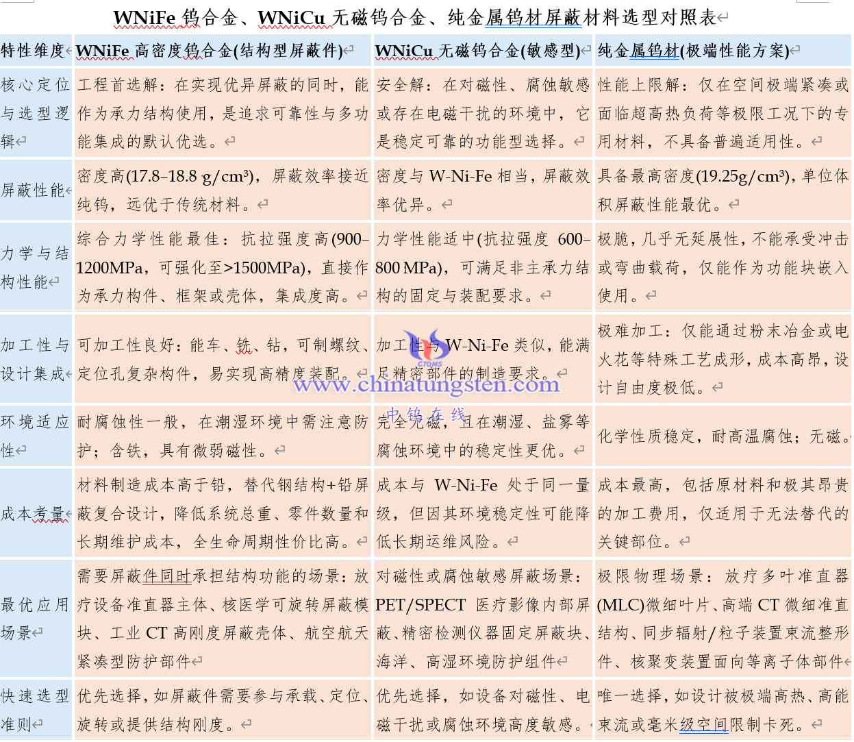 WNiFe钨合金、WNiCu无磁钨合金、纯金属钨材屏蔽材料选型对照表