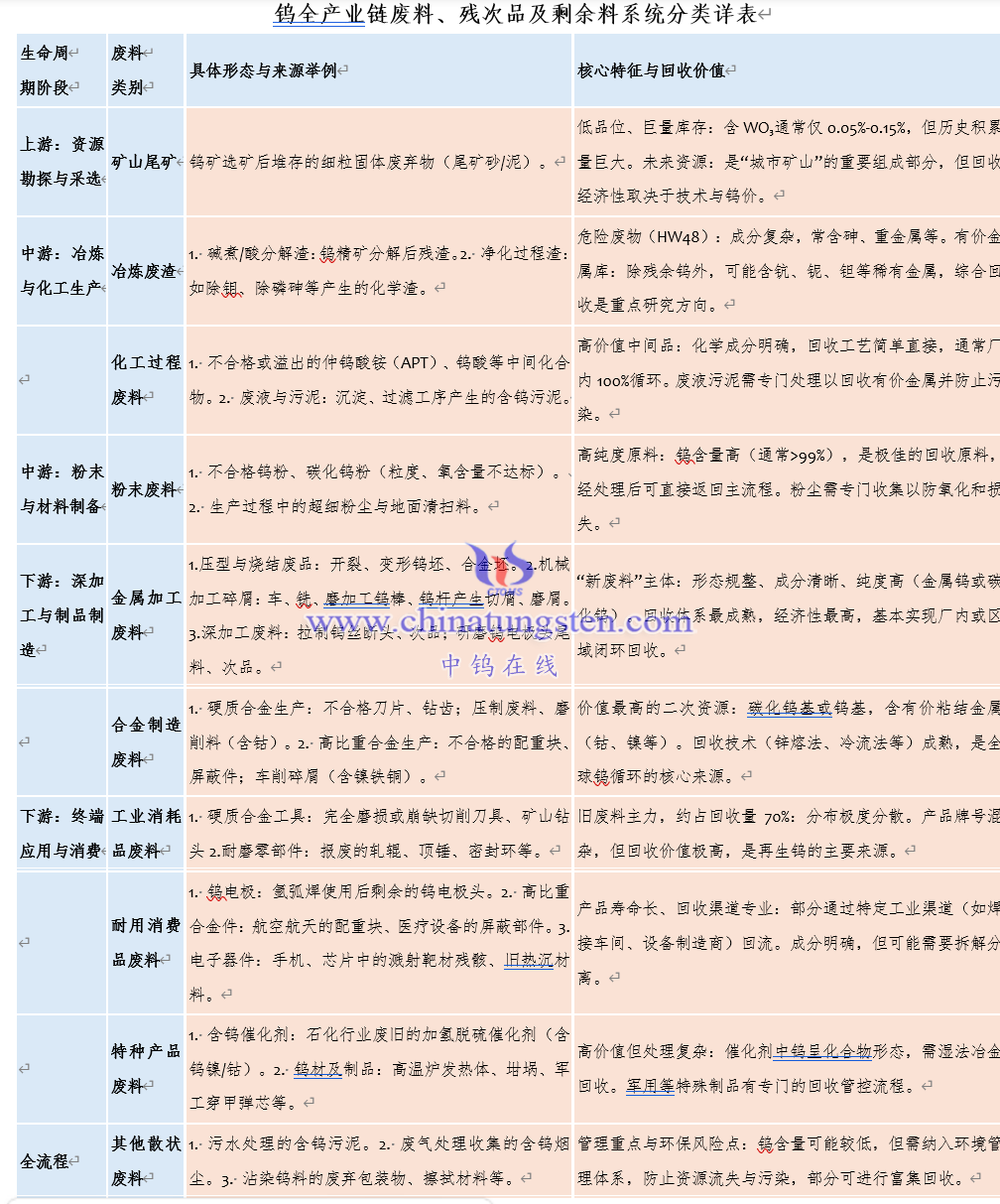 钨是一种典型的高价值、可循环利用金属,从矿山到终端产品的整个生命周期中都会产生不同形态的废料。与很多金属不同,钨的再生利用已经成为全球供应体系的重要组成部分,尤其是在硬质合金领域,再生钨甚至是主要原料来源之一。根据中钨智造科技有限公司在生产环节各方面的实践经验总结,认为钨废料的类型,可以主要根据其产生阶段和物理化学形态来划分。从矿石冶炼、产品生产到最终报废,钨废料贯穿其全生命周期,形态多样。