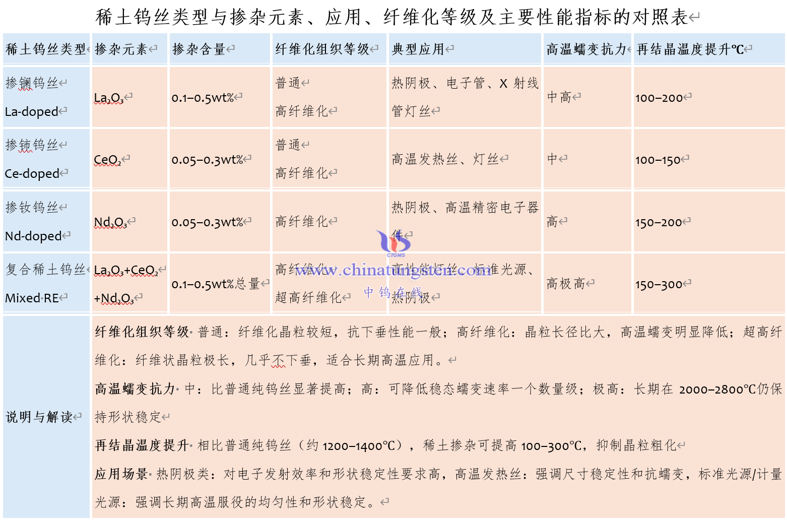 稀土钨丝类型与掺杂元素、应用、纤维化等级及主要性能指标的对照表