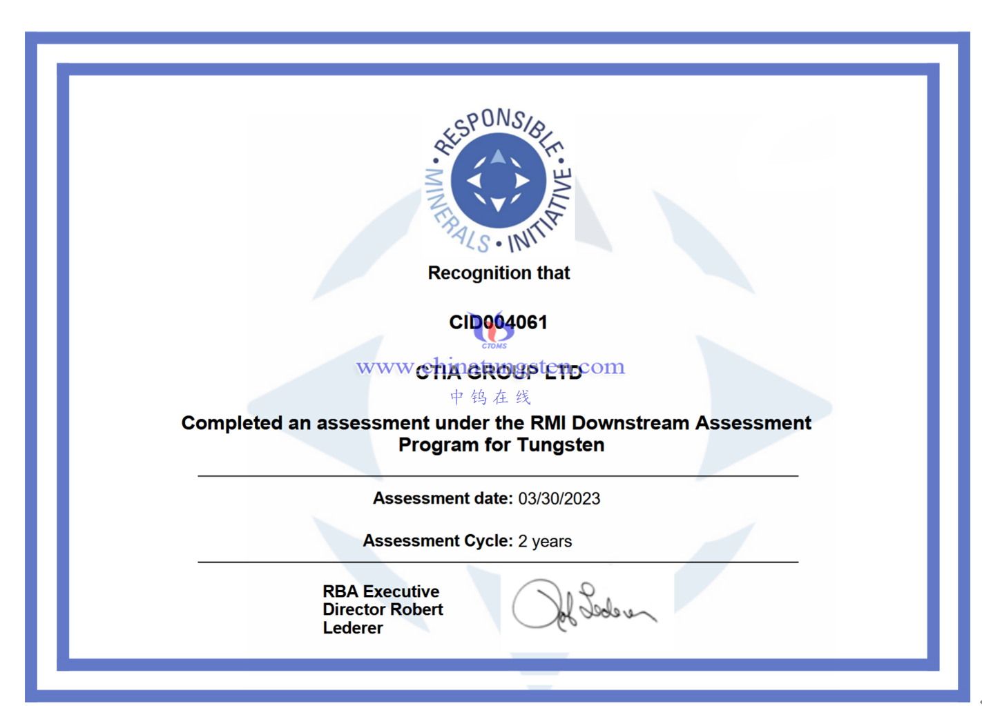 中钨智造建立了基于 ISO9001:2015的质量管理体系(见证书图片),全面覆盖原材料采购、生产过程控制、尺寸检测与出厂检验。公司为 Responsible Minerals Initiative (RMI) 认证的合规下游供应商(见认证书图片),确保材料来源合法可追溯。