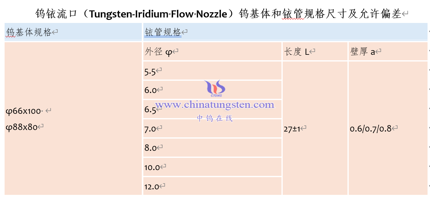钨铱流口(Tungsten-Iridium Flow Nozzle)钨基体和铱管规格尺寸及允许偏差