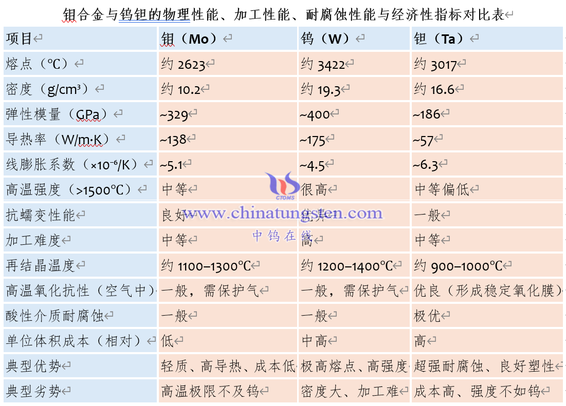 钼合金与钨钽的物理性能、加工性能、耐腐蚀性能与经济性指标对比表