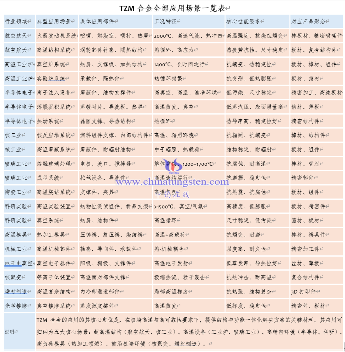说明 TZM合金的应用的其核心定位是,在极端高温与高可靠性要求下,提供结构与功能一体化解决方案的关键材料。其应用可归纳为五大核心场景:超高温结构(航空航天、核工业)、高温设备(工业炉、玻璃工业)、高精密环境(半导体、科研)、高负荷模具(热加工领域)、前沿极端环境(核聚变、增材制造)。