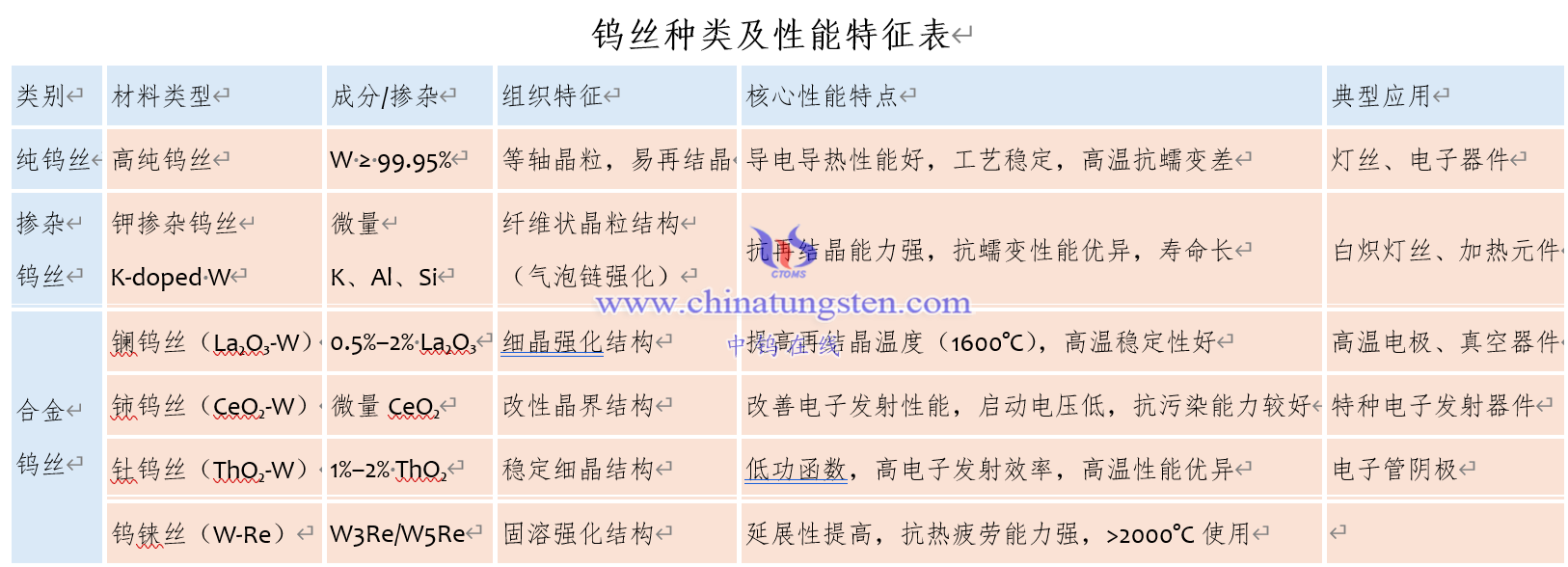 钨丝种类及性能特征表