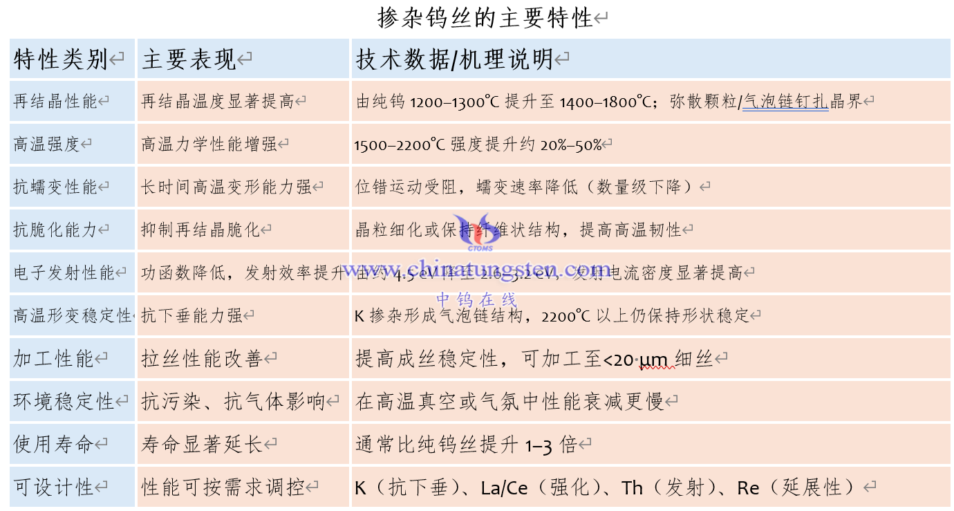 掺杂钨丝是通过在高纯钨基体中引入微量功能元素(如K、La₂O₃、CeO₂、ThO₂等)形成的高性能钨基丝材,其核心在于通过气泡链强化、弥散强化或电子功能调控,显著改善纯钨丝在高温环境中的组织稳定性与功能性能。与纯钨丝相比,掺杂钨丝不再是单一物理性能材料,而是具备结构与功能协同优化的工程材料体系。