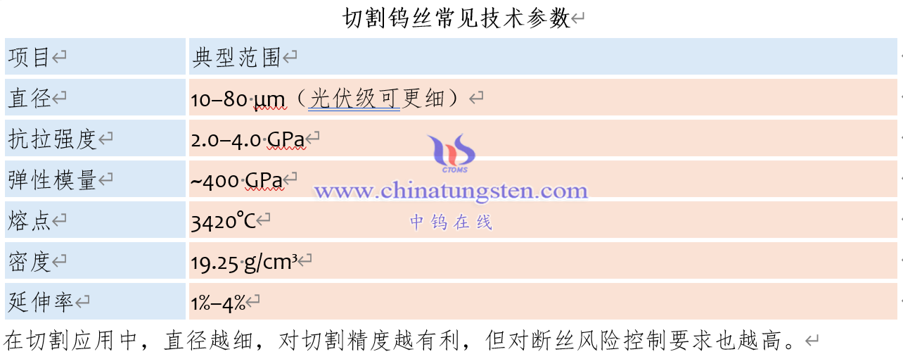 切割钨丝常见技术参数